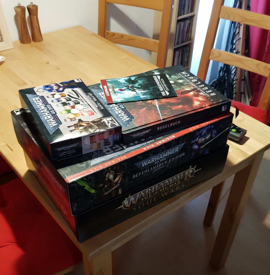 Ich habe mich jetzt dazu entschieden mit dem Tabletop von Games Workshop anzufangen, denn das Thema hat mich einfch zu sehr gereizt. Und nun sind auch die beiden Spiele bei mir eingetroffen. Dazu noch etwas Farbe und das umfangreiche handbuch für Warhammer 40k, da in der Box nur eine abgespeckte Variante ist, ganz im gegen teil zur Box von Age of Sigmar. Dafür gibt es bei 40k gleich noch Geländeteile mit dazu und ein Schlachtfeldbrett. Das bedeutet nun, dass ich jetzt einiges zu tun habe, schließlich wollen die Figuren für beide Spiele zusammengebaut und anschließend auch noch bemalt werden. Bei Age of Sigmar ist das mit dem bemalen nicht das Ding, da beide Fraktionen feststehen. Bei 40k sind aber Space Marines enthalten, und da gilt es sich für einen Orden zu entscheiden. Denn jeder Orden spielt sich anders, und die Ultramariens die ja quasi empfohlen werden sind mir doch etwas zu langweilig. Ich habe mich schon etwas eingelesen und habe die Auswahl jetzt auf zwei Orden eingegrenzt. Aber noch kann ich mir ja Gedanken machen, denn gestern habe ich erst einmal angefangen das grundbuch zu Age of Sigmar zu lesen und die Hintergrundgeschichte zu dieser Welt in Erfahrung gebracht. Bis zu den regeln ist es aber noch etwas denn das Grundbuch hat 320 Seiten. Und anschließend geht es dann mit ebensovielen Seiten zu 40k weiter. Die Regelbücher mit ihren tollen Hintergrundgeschichten sind wirklich sehr schön, vor allem weil man auch viele Beispiele für die Bemalung usw bekommt. Aber dazu werde ich dann entsprechend noch seperat drüber berichten. Die Hintergrundgeschichte von Age of Sigmar ist jedenfalls soweit ich sie bisher gelesen habe wirklich spannend und es macht Spaß in diese Welt zu tauchen. Ich denke am Wochenende werde ich mal damit anfangen die ersten Modelle zusammenzubauen und bis dahin natürlich auch noch weiter lesen.