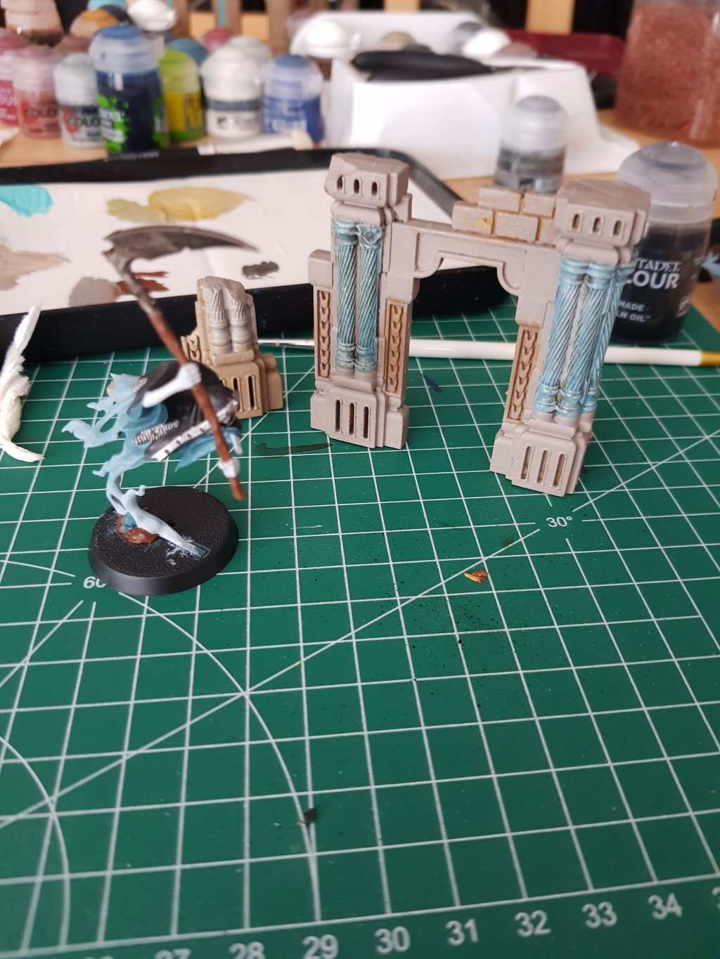 Die Stormcasts habe ich ja bereits soweit fertig auch wenn ich befürchte, dass es mit den Bases dann doch länger dauert als ich jetzt so hoffe. Denn neben den Nighthaunts die auch so gut wie fertig sind (abgesehen von den Bases) fange ich nun an die ersten Geländestücke zu bemalen. Und da hatte ich damit gerechnet, dass es zügig geht. Doch das ist dann leider doch nicht so der Fall. Denn es soll ja farblich zum Untergrund der Spielplatte passen, und so habe ich doch einige Zeit benötigt bis ich den richtigen Farbton getroffen habe. Ist wie bei den Übergängen von weiß zu blau bei den Nighthaunts (siehe Beitrag: Nighthaunts). Da wird dann halt erst einmal mit den Farben experementiert bevor ich dann so weit zufrieden bin und es tatsächlich dann bemalen kann. Ich mag es die Figuren usw. zu bemalen, aber ich freue mich natürlich schon darauf, dass erste mal alles auf den Tisch zu stellen und die eigenen Figuren auf dem Schlachtfeld herumzuschubsen. Und dann geht es auch gleich weiter mit dem bemalen. Die Verstärkung für die Stormcasts sind eingetroffen, dazu Orks, und die Nighthaunts sollen auch noch ergänzt werden. Und dann steht da ja noch die Warhammer 40k Box die natürlich auch noch zusammengebaut und bemalt werden möchte. Ich glaube jetzt weiß ich langsam was die Leute mit Pile of Shame meinen 😉
