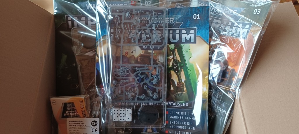 Heute sind die ersten drei Ausgaben von Warhammer Imperium eingetroffen. Während es am Kiosk nur Ausgabe 1 gibt, bekommt man im Abo gleich die ersten drei Zeitschriften zusammen. Dazu noch ein Päckchen mit Kleber, Seitenschneider und entgrater. Bei den Zeitschriften liegen auch noch Figuren, Farben, Pinsel und anderes bei. Die Zeitschriften erklären wie man die Modelle zusammenbaut, sie bemalt, Hintergründe zum Universum 40k, und wie das Spiel funktioniert. Das ganze quasi Step by Step von Ausgabe zu Ausgabe. So ist es gerade für Anfänger eine gute Möglichkeit bei Warhammer40k einzusteigen. Aber auch für Fortgeschrittene ist es durchaus eine interessante Sache da die Figuren günstiger sind als wenn man sie sich regulär zulegt, und man mit der Necronseite auch eine richtig tolle Armee hat. Auf der Seite des Imperiums bekommt man natürlich Space Marines, aber auch Adeptus Mechanicus und Adeptus Soritas Figuren was auch diese Seite interessant macht. Ich werde aber noch einmal seperat auf die Ausgaben eingehen damit ihr einen Überblick bekommt was einen da erwartet.