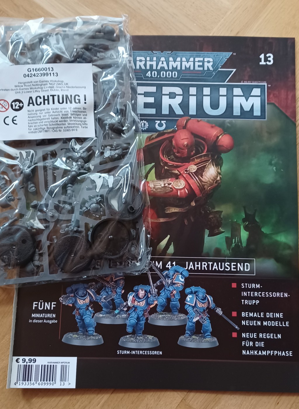 Mit Ausgabe 13 erreichen wir das letzte Heft der dritten Lieferung. Mittlerweile ist auch schon Lieferung Nummer vier eingetroffen die Hefte und Modelle von Ausgabe 14 bis 19 enthält. Doch zurück zu Ausgabe 13 mit der man fünf weitere Sturm-Intercessoren bekommt. Es gab schon einmal einen Trupp Sturm-Intercessoren der jedoch nur drei Figuren enthielt. Nun also eine Verstärkung der normalen Linientruppen, und im Gegensatz zu den Figuren in Ausgabe drei (siehe Beitrag: Warhammer Imperium 3), haben diese zum Glück kein Ultramarienes Abzeichen auf der Schulterpanzerung. Das erspart mir also das entfernen ebenjener auch wenn es kein großes Hexenwerk war. Ebenfalls in der Ausgabe wir ein wenig mehr über die Abstammung der Necrons beschrieben, sowie eine Kurzgeschichte die ebenfalls zeigt wie die Necrons „funktionieren“. Dann die übliche Bau- und Bemalanleitung die wie immer sehr gut gemacht und bebildert ist, dass es wirklich unmöglich ist die Figuren falsch zusammenzusetzen, sowie eine neue Mission mit unterschiedlicher Truppzusammensetzung.