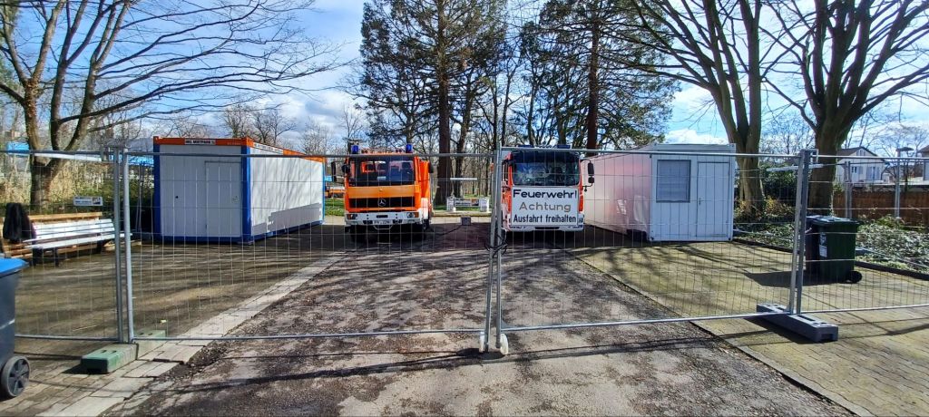 Das ist auch mehr als überfällig. In unserem derzeitigen Gerätehaus haben wir uns die ganze Zeit über in der Fahrzeughalle umgezogen. Als dann das neue Fahrzeug kam, war dies aus Platzgründen schon nicht mehr möglich, und es wurde ein Container hinter dem Gerätehaus aufgestellt. Dort gab es dann auch eine Trennung zwischen Damen und Herrenumkleide. Trotzdem war alles sehr beengt, und einige Kameraden mussten sich auch weiterhin in der Fahrzeughalle hinter dem TLF welches etwas kürzer ist umziehen. Von einer vernüftigen Möglichkeit der schwarz-weiß Trennung war überhaupt keine Rede, Duschen gab es auch nicht. Also alles eher eine Zumutung. Doch jetzt kommt der Neubau und alle freuen sich schon wahnsinnig darauf. Zum Neubau kommen dann auch noch zwei neue Fahrzeuge, schließlich haben wir im neuen Gerätehaus drei Stellplätze. Neben unserem MLF bekommen wir noch ein neues Hilfeleistungslöschgruppenfahrzeug (HLF) und einen neuen Gerätewagen (GW). Dafür kommen das Tanklöschafhrzeug (TLF) und der LKW der einfach hinter dem alten Gerätehaus geparkt war weg. Das bedeutet natürlich auch eine Menge Ausbildungsbedarf. Denn mit dem HLF werden wir dann auch den Autobahnabschnitt betreuen, und dort Technische Hilfeleistung mit dem HLF übernehmen. Und das ist dann deutlich anspruchsvoller als bisher. Auch wird unser Löschbezirk deutlich vergrößert, da der neue Stadtteil Dietenbach der gerade entsteht, zur Hälfte uns zugeteilt wird. Damit haben wir mit Landwasser, Betzenhausen, Mooswald, Landwasser, Lehen und den neu entstehenden Dietenbach einen großen Löschbezirk mit den wahrscheinlich meisten Anwohner in Freiburg. Da unser altes Gerätehaus jetzt abgerissen wird, was wir auch noch einmal mit unseren Partnern aus Innsbruck gefeiert haben, muss bis zur Fertigstellung des neuen gerätehauses eine Übergangslösung her. Und so wurden jetzt erst einmal zwei Container aufgestellt und ein umzäunter Bereich für die Fahrzeuge geschaffen.