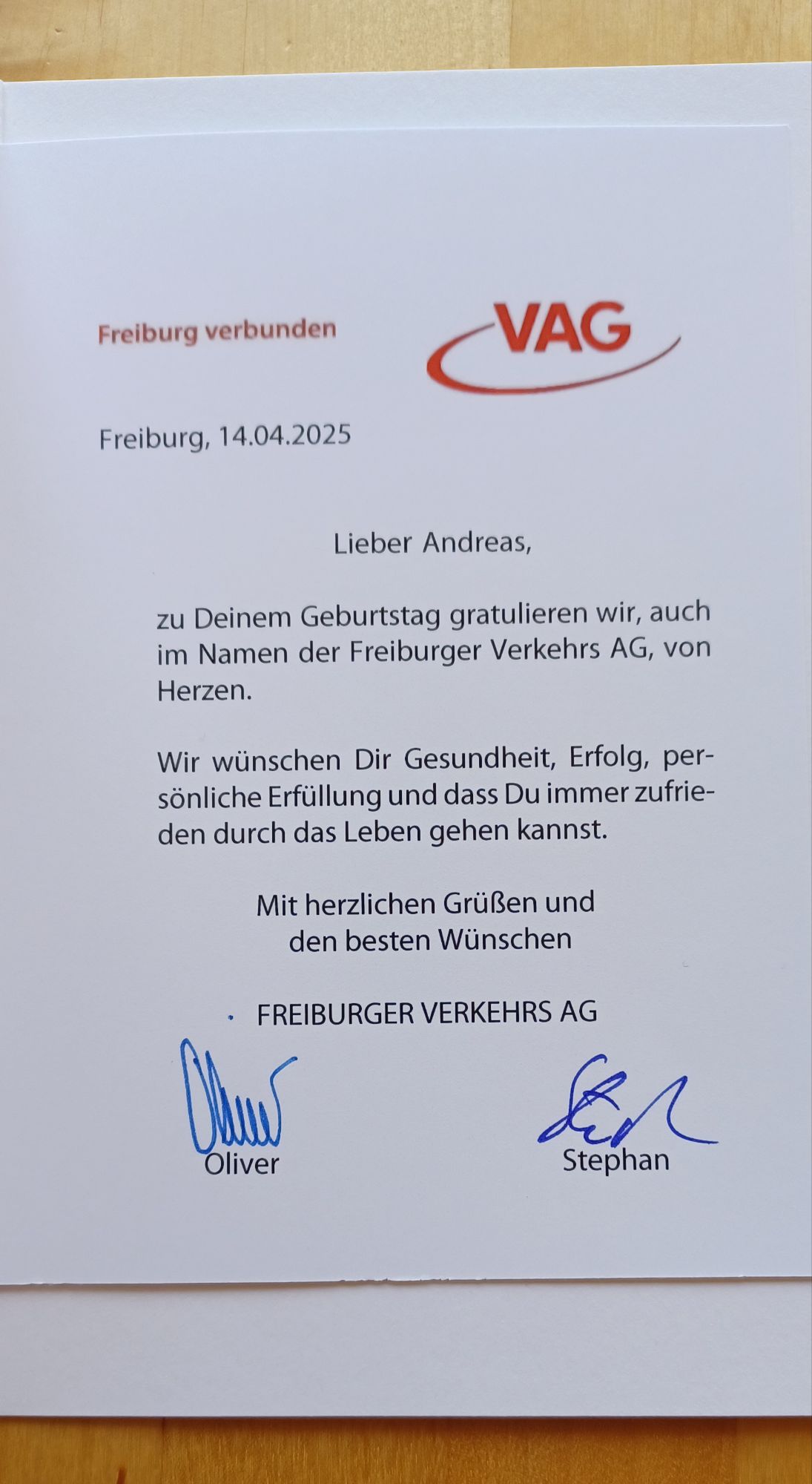 Eigentlich habe ich ja Urlaub, doch für diesen Samstag hat man gefragt ob ich einspringen kann. So habe ich heute einen Frühdienst übernommen, der um 5:13 Uhr begonnen hat. Da ich halt eingesprungen bin, gibt es für den Dienst neben den regulären Nachtzuschlag, auch noch 9:10 Stunden auf mein Überstundenkonto. Zumindest wenn alles regulär gelaufen wäre. Denn kurz vor Feierabend hat mich die Leitstelle angefunkt und angefragt ob ich etwas länger fahren kann da meine Ablösung noch nicht da ist. So bin ich dann noch etwas länger gefahren und mein Dienst ging dann eine halbe Stunde länger als ursprünglich. Das wird mir selbstverständlich auch noch gutgeschrieben. Also werde ich die Tage mal schauen was ich jetzt endgültig an Stunden bekomme. Irgendwie war es nach zwei Wochen auch echt nett mal wieder einige Arbeitskollegen zu sehen und ein paar Runden mit den bahnen zu drehen. Trotzdem werde ich jetzt aber auch noch meine letzten Urlaubstage genießen bevor dann ab dem 28.4 der Alltag weiter geht. Da ich dann heute halt arbeiten war, konnte ich aber auch mal einen Blick in mein Postfach werfen wo ich eine Geburtstagskarte vorgefunden habe. Das ist auch so eine Kleinigkeit die ich tatsächlich zu schätzen weiß, auch wenn es ja nur eine Kleinigkeit ist. Man bekommt jedes Jahr von der Geschäftsführung einfach eine nette Geburtstagskarte, auch wenn ich mich echt daran gewöhnen muss, dass man mit der Geschäftsführung per „Du“ ist und auch tatsächlich mit den Vornamen unterschrieben wird. Ich finde es zwar gewöhnungsbedürftig aber auch nicht schlimm. Wenn man es aber tatsächlich gar nicht möchte kann man das tatsächlich angeben und man wird weiterhin per „Sie“ angesprochen und -geschrieben.