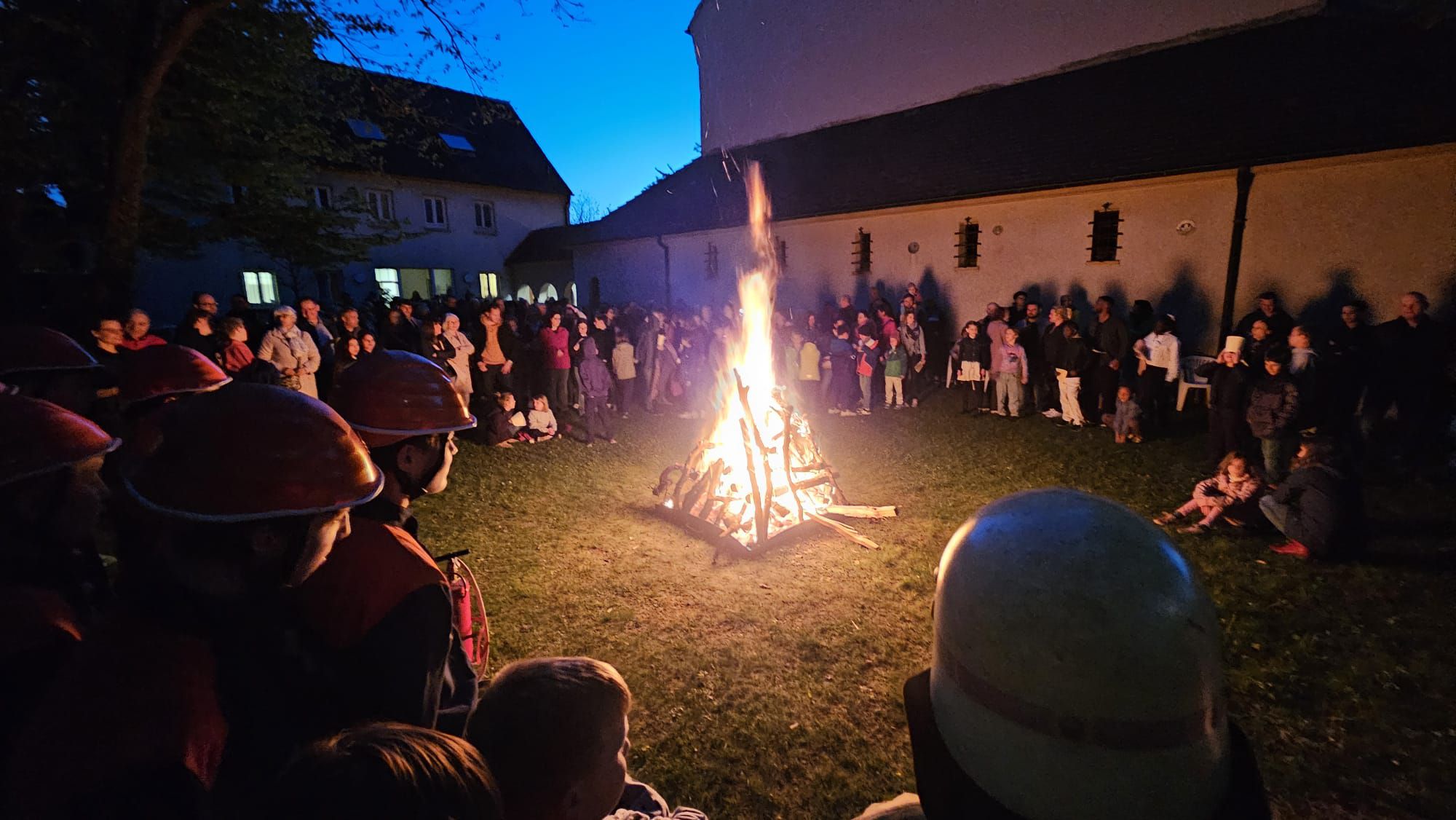 Nachdem also das Feuer entzündet war, fand sich die Gemeinde gegen 21 Uhr ein und so versammelten sich Gemeinde, Ministranten, Pastor und Chor um das Feuer. Es wurde gesungen, gebetet, und die Osterkerze am Feuer entzündet. Für die Gemeinde ging es dann zum Gottesdienst in die Kirche, während die Jugendfeuerwehr dann noch das Feuer weiter betreut hat.