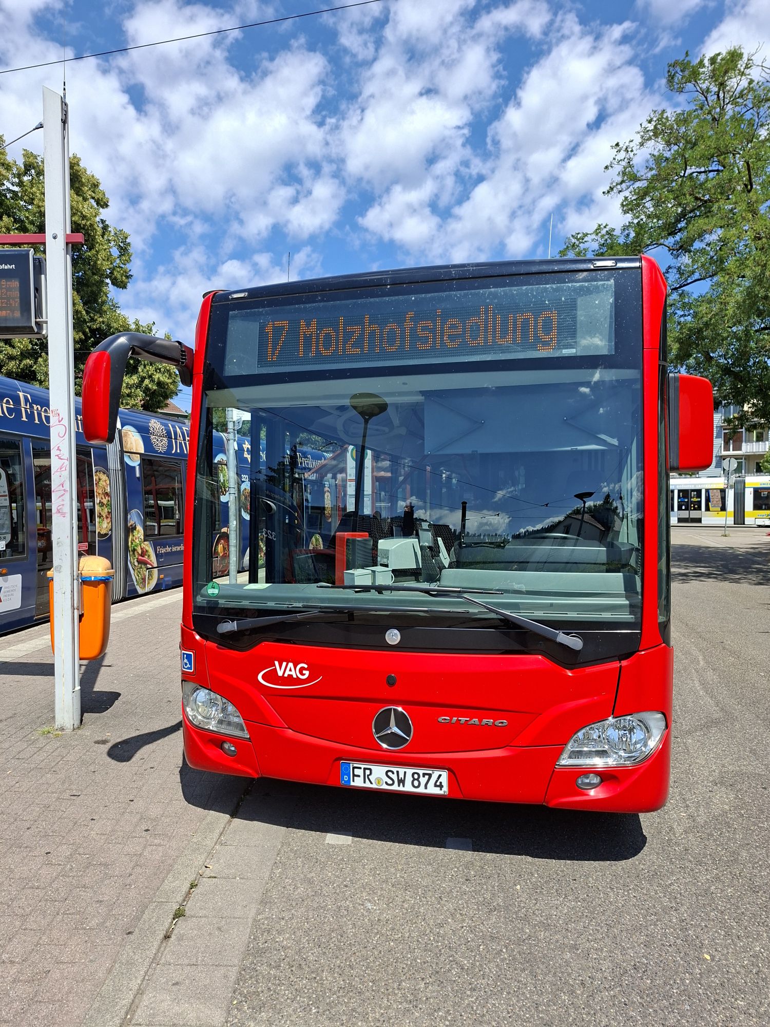 Eigentlich hätte ich am Sonntag einen gemischten Tagdienst, das bedeutet Bahn und Bus gehabt. Doch dann haben die Diensteinteiler angerufen und gefragt, ob ich auch einen Busdienst nehmen könnte. Der fing später an, und endete auch nur sieben Minuten später als der ursprüngliche Dienst. Ich habe den Dienst dann getauscht und es hat sich mehr als gelohnt. Nicht nur das er kürzer war, auch der Dienst war top. Aufrüsten des Busses um kurz nach zehn, und dann ging es auf die Lininen 17 & 18 in Ebnet und Kappel. Den ganzen Tag auf den gleichen Bus, also ohne herumfahren und Fahrzeugwechsel. Und dazu noch den Bus 847 der schon besonders ist. Zum einen hat er Reisebustüren und auch die Innenausstattung ist mit einem Gepäckfach über den Sitzen. Zudem fährt er sich einfach super. So war es wirklich ein sehr entspannter Dienst. Sonntage sind ja eh immer ruhig und die Fahrgäste deutlich entspannter. Ich freue mich schon auf die sechs Wochen Sommerferien die ja auch bald beginnen. Dann ist es auch unter der Woche einfach deutlich weniger hektisch…