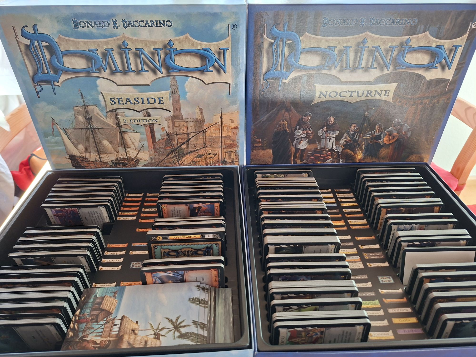 Vor gut einem Jahr hatte ich eine große Box des Spiels Dominion (siehe Beitrag: Dominion) gekauft. Das Spiel war damals schon älter doch es macht einfach riesig Spaß. Und diese Box beinhaltete neben dem Bsisspiel schon drei Erweiterungen. Mittlerweile sind aber noch zwei weitere Erweiterungen dazu gekommen die das Spiel einfach immer weiter verfeinern. Vor allem habe ich noch nie ein Partie mit dem gleichen Kartendeck gespielt weil die Auswahl und Kombinationsmöglichkeiten einfach so umfangreich sind. Jetzt habe ich noch die Erweiterungen Nocturne die eine zusätzliche Phase im Spiel beinhaltet, und Seside wa viele Karten enthält die über zwei Spielzüge gespielt werden. Und vor allem ist das Spiel zu zweit wie auch mit mehreren gut spielbar, und wie schon geschrieben einfach super vielseitig. Und so spiele ich das Spiel immer wieder gerne, und da es ja noch etliche Erweiterungen gibt wird es auf absehbare Zeit auch nicht wirklich langweilig werden und noch etliche Stunden Spielspaß garantieren.