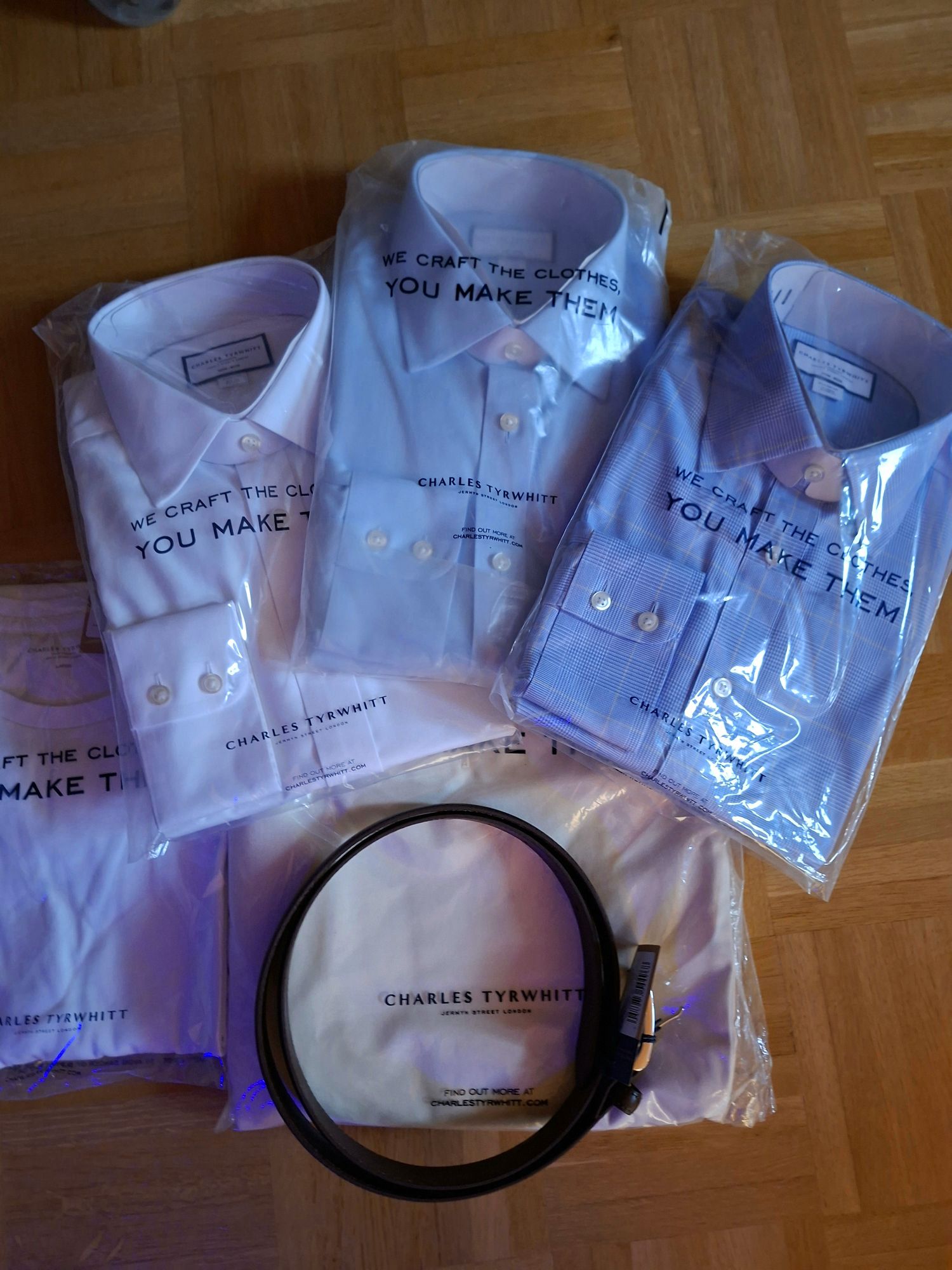 Der Shop Charles Tyrwhitt ist bekannt, dass man gute Hemden für einen soliden Preis bekommt, da sie eigentlich immer drei Hemden für unter 100 Euro anbieten. Und vor allem kann man diese direkt nach Kragenweite und Ärmellänge wählen oder die individuelle Ärmellänge angeben und machen lassen. Man bekommt also gut sitzende Hemden. So habe ich jetzt dort einfach mal drei klassische Oxford Hemden in Weiß, Himmelblau und Oceanblau mit Prince of Wales Karos bestellt. Auch Hosen kann man nach Beinlänge und Bundweite ordern, wobei die Webseite da doch etwas unübersichtlich ist. Einmal kann man Angaben in cm angeben, dann wiederum in Zoll. Aber gut wenn man einmal seine Maße kennt ist es einfacher sich dort zurecht zu finden. Dazu ein einfaches weißes T-Shirt aus einem dickeren, blickdichten Stoff, sowie eine Chino in Elfenbeinfarben und einen Schokoladenbraunen Ledergürtel. Die Hemden kann man gut zu einem Anzug kombinieren, aber eben auch zu meinen Chinos wenn es mal nicht ein T-Shirt und Sneakers sein soll. So hat man dann mit Chinos, Hemd und Budapester ein Smart Casual Outfit wenn man mal Essen geht. Oder man kombiniert die Hemden mit einer Jeans. Mit Lieferung und Qualität der Marke bin ich bisher auch zufrieden, und gerade die Hemden die echt gut sind, haben natürlich ein fast unschlagbaren Preis. Chino, Gürtel und T-Shirt habe ich eher aus Bequemlichkeit dort mitbestellt da ich auch nicht bei tausenden unterschiedlichen Shops bestellen möchte. Aber auch bei diesen Produkten passt Preis und Leistung.