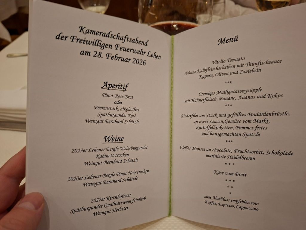 Dieses Jahr gab es Vitello Tonnato was schon sehr lecker war. Anschließend gab es Suppe, die tatsächlich ungewöhnlich da eher fernöstlich und lecker war, und doch irgendwie zum Menü gepasst hat. Da ja mit der Ehrenabteilung auch einige ältere Leute beim Abend dabei sind war die Suppe zwar gut gewürzt aber nicht scharf. Deswegen gab es auch noch Chiliöl wenn man es schärfer haben wollte. Der Hauptgang war dann wieder etwas ganz Klassisches. Das Rindfleich war auf den Punkt und inner zart rosa und auch alles andere war perfekt. Zudem gab es auch ordentlich Nachschlag, genau wie beim Wein. Sobald das Glas sich ansatzweise geleert hat, stand schon eine Servicekraft da um nachzuschenken wenn man wollte. Der Service war halt wie immer im Bierhäusle super, und das Essen einfach spitze. Ich mag es einfach dort als Gast einzukehren. Und wie immer beim Kameradschaftsabend wurde es sehr lang und ging dann bis um vier Uhr in der Früh. Wie immer war es einfach ein gelungener Abend.