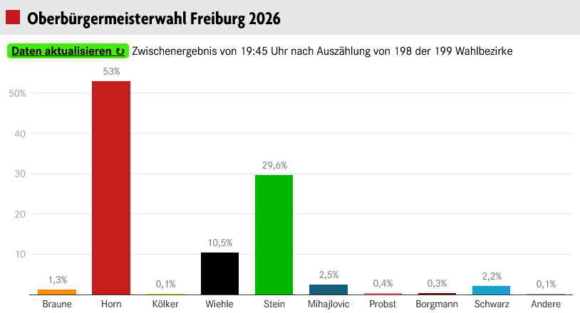 Ich hatte tatsächlich damit gerechnet, dass das Ergebnis knapper wird, doch die Verpackungssteuer die in Freiburg wegen der dilettantischen Ausführung der Verordnung nur zu Kopfschütteln geführt hat, ist der Kandidatin Stein wohl auf die Füße gefallen. Denn diese Steuer wurde gegen den Willen des Oberbürgermeisters im Main 2025 mit knapper Mehrheit von 26 zu 22 Stimmen im Gemeinderat beschlossen. Die Befürworter waren hauptsächlich die Grünen, die Kulturliste, Liste Teilhabe & Inklusion, „Eine Stadt für Alle“ (Linke Liste, Grüne Alternative, Unabhängige Frauen), FR4U (Volt, Die Partei, Urbanes Freiburg) und Freiburg Lebenswert. Eben jene Parteien die jetzt Monika Stein im Wahlkampf unterstützt haben. Martin Horn konnte sein Ergebnis nun deutlich steigern, nachdem er bei der letzten Wahl noch gegen Dieter Salomon und Monika Stein in die Stichwahl musste. Deswegen dachte ich auch, dass es heute ein deutlich engeres Rennen wird, da 2018 Salomon von den Grünen (31%) und Stein von der Grünen Alternativen Liste Freiburg bereits 24% erreicht hat. Das Ergebnis ist also ein deutliches Zeichen der Freiburger Bürger.