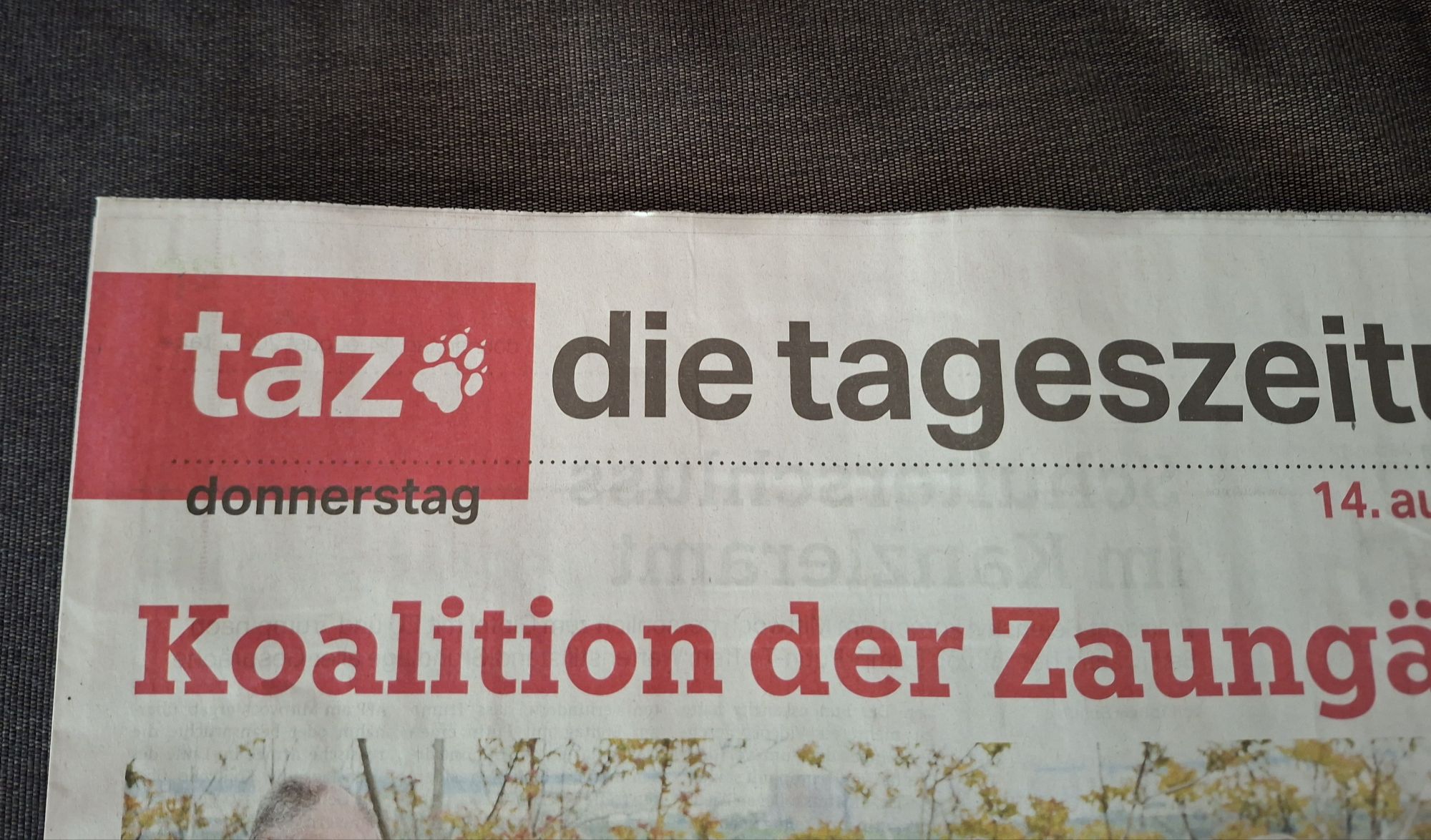 Ich habe mir mal ein Probeabo der taz gegönnt. Es hat zwar jetzt eine Woche gedauert bis die Belieferung anfing aber damit kann ich leben. Mir war nur wichtig, dass die Zeitung nicht mit der Post sondern mit den anderen Tageszeitungen ausgeteilt wird damit ich sie mit zur Arbeit nehmen kann. Jetzt bekomme ich also 5 Wochen lang die taz geliefert und muss mich auch nicht um irgendetwas kümmern da sich das Probeabo nicht automatisch verlängert was ich mal richtig gut finde. Und 5 Wochen für 10 Euro ist auch ein richtiges Schnäppchen.