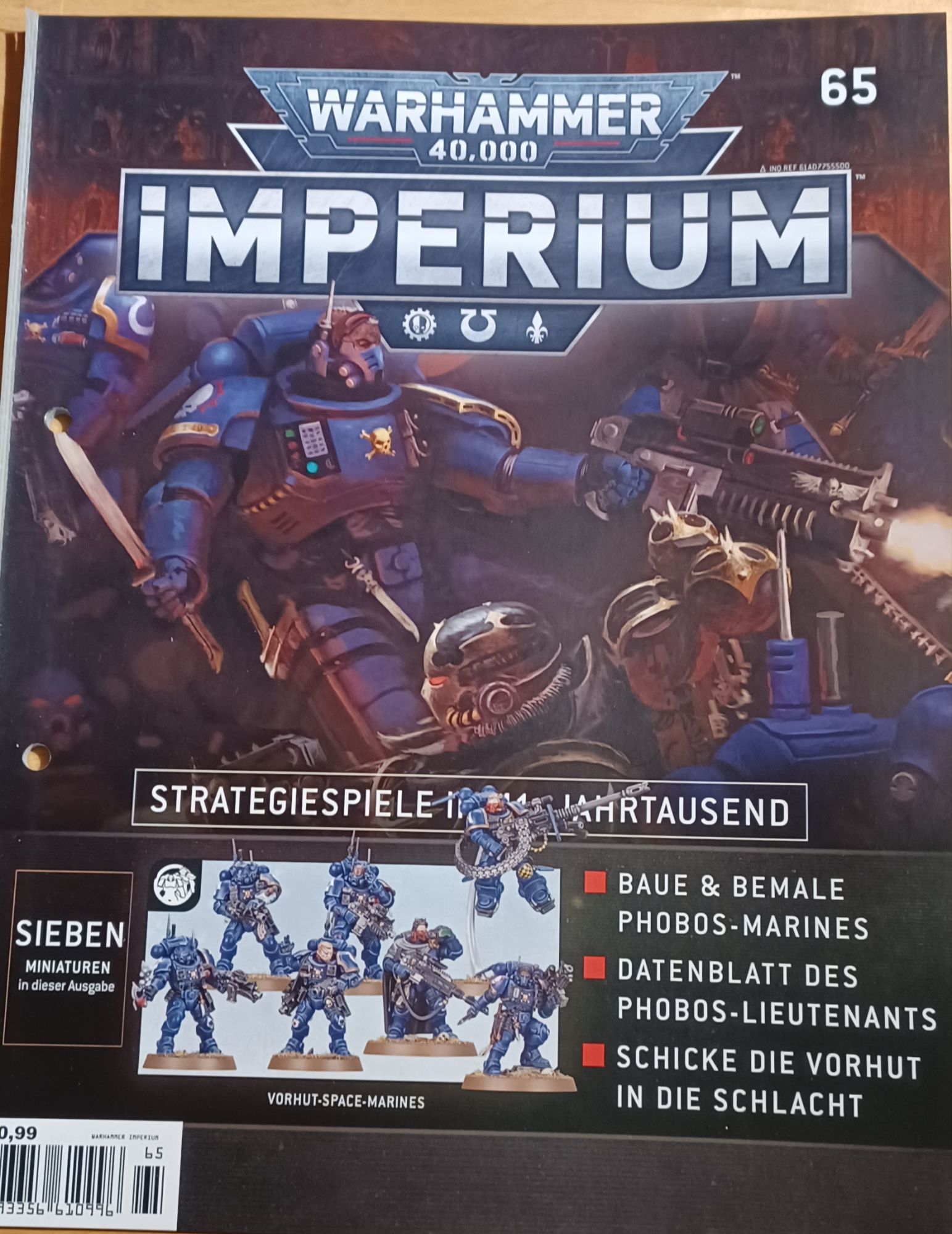 Mit Ausgabe 65 kommen erneut Modelle der Space Marines, und zwar sieben Stück an der Zahl. Es sind wieder Vorhut Space Marines inkl. Phobos-Lieutenant. Diese Space Marines sind besonder für verdeckte Operationen hinter den feindlichen Linien ausgerüstet. Dementsprechend umfangreich ist auch die Zusammenbau- und vor allem die Bemalanleitung in dieser Ausgabe. Dazu dann noch das obligatorische Tutorial zur Fähigkeit „Taktische Präzision“ die der Lieutenant besitzt, sowie eine Mission zum spielen. An Hintergrundwissen gibt es etwas zu den „Fahrzeugen“ der Space Marines zu erfahren, und zwar den Redemtor Dreadnoughts und den Invictor. Aber es werden auch zwei Helden vorgestellt. In diesem Fall beide vom Orden der Space Wolfes. Dabei handelt es sich um Logan Grimnar und Ragnar Blackmane.
