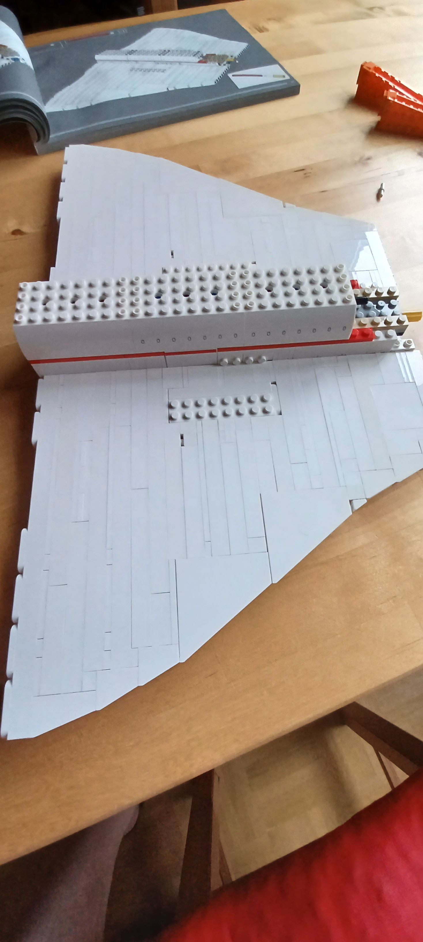Mittlerweile ist der Bau nicht nur noch weiter fortgeschritten, wie in den obrigen beiden Bildern zu sehen, sondern ganz abgeschlossen. Das Modell verfügt über ein Fahrwerk welches man ein- und ausfahren kann, sowie eine Sektion bei der man auch die angedeutete Inneneinrichtung (oberste Bild) sehen kann. Besonders gut gefällt mir, dass dieses Set keine Aufkleber enthält sondern alle Beschriftungen Drucke sind. Auch der original Blauton am Seitenleitwerk ist wirklich sehr schön. Allerdings muss man sich auch im klaren sein wo man das Modell aufstellen möchte, da es die Abmaße der SturnV (siehe Beitrag: Lego Staurn V) hat. Allerdings ist dieses Set wegen der Deltaflügel auch noch um einiges breiter, und hat mit knapp über 2000 Teilen, auch ein wenig mehr als die Saturn. Aufgebaut hat es beeindruckene Maße von 105cm Länge, 43cm Breite und 15cm Höhe.